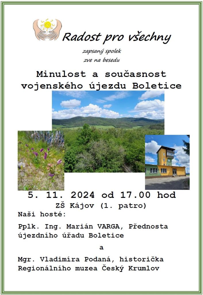 V úterý 5. 11. 2024 v ZŠ Kájov se uskuteční beseda "Vojenský újezd Boletice" s pplk. Ing. Mariánem Vargou, přednostou újezdního úřadu a Mgr. Vladimírou Podanou, historičkou Regionálního muzea Český Krumlov.